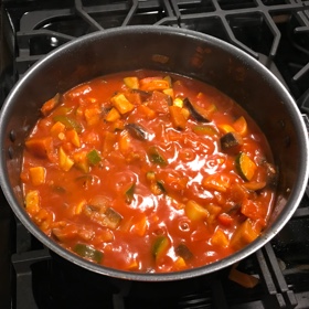 Add squash, zucchini, eggplant, thyme, salt, and pepper then cook another 7 minutes, until veggies are tender.
